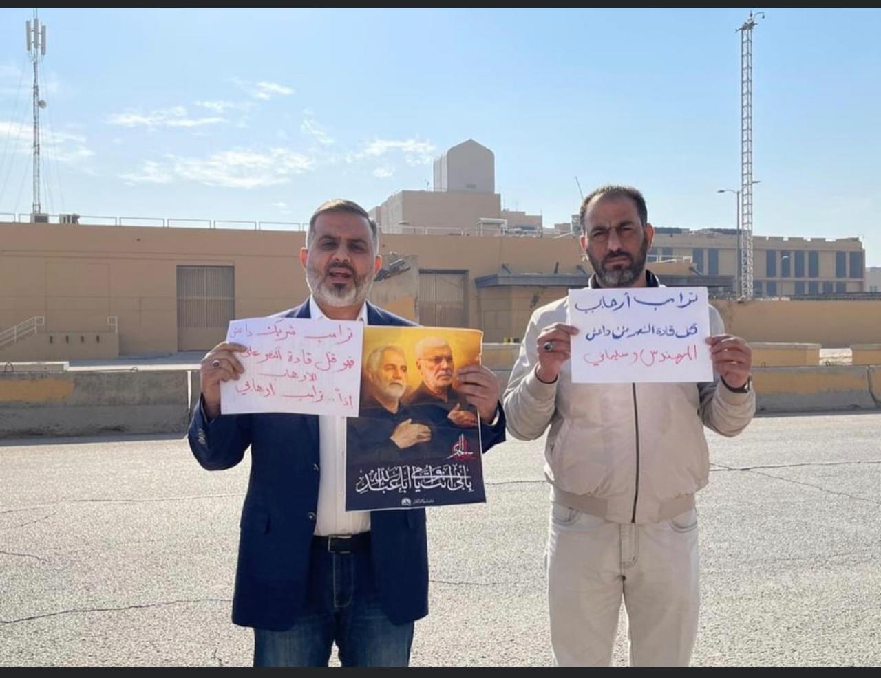 تظاهر برلمانيان عراقيان، صباح الاحد، (3 كانون الثاني 2020)، امام مقر السفارة الاميركية في العاصمة بغداد في الذكرى لسنوية الاولى لحادثة المطار، ووصفا عبر يافطة رفعاها الرئيس الاميركي دونالد ترامب بأنه "ارهابي".