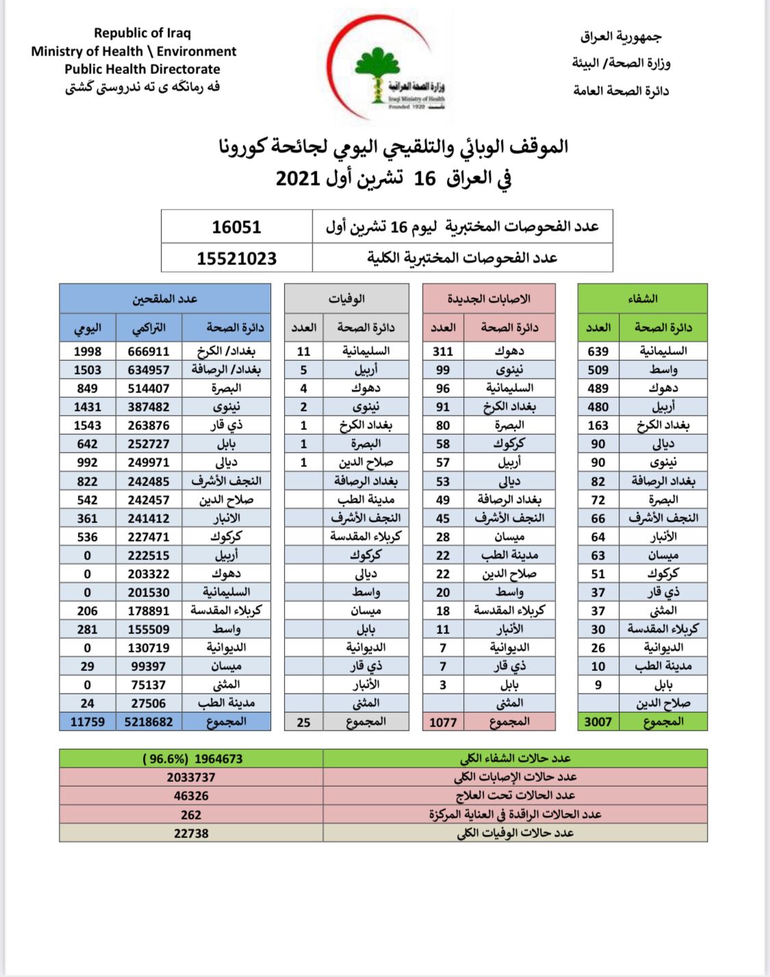 أعلنت وزارة الصحة، اليوم السبت، الموقف الوبائي لجائحة كورونا في عموم العراق.