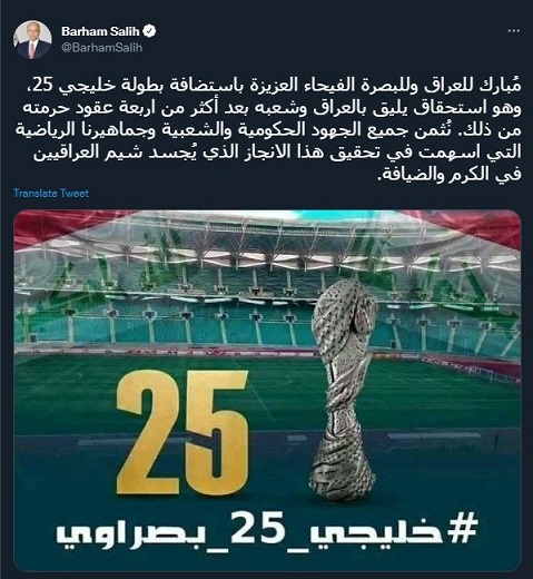 وقال صالح في تغريدة: "مبارك للعراق وللبصرة الفيحاء العزيزة باستضافة بطولة خليجي 25"، مبينا انه "استحقاق يليق بالعراق وشعبه بعد أكثر من اربعة عقود حرمته من ذلك".