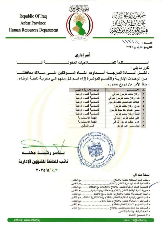أصدرت السلطات الإدارية في محافظة الأنبار، اليوم الأحد (25 أيار 2025)، قرارا بنقل عدد من الموظفين المنتمين إلى عشيرة “البو مرعي” قسرا من مواقع عملهم، وذلك بعد يوم واحد فقط من حادثة "طرد" هيبت الحلبوسي من منطقة الطاش في مدينة الرمادي.