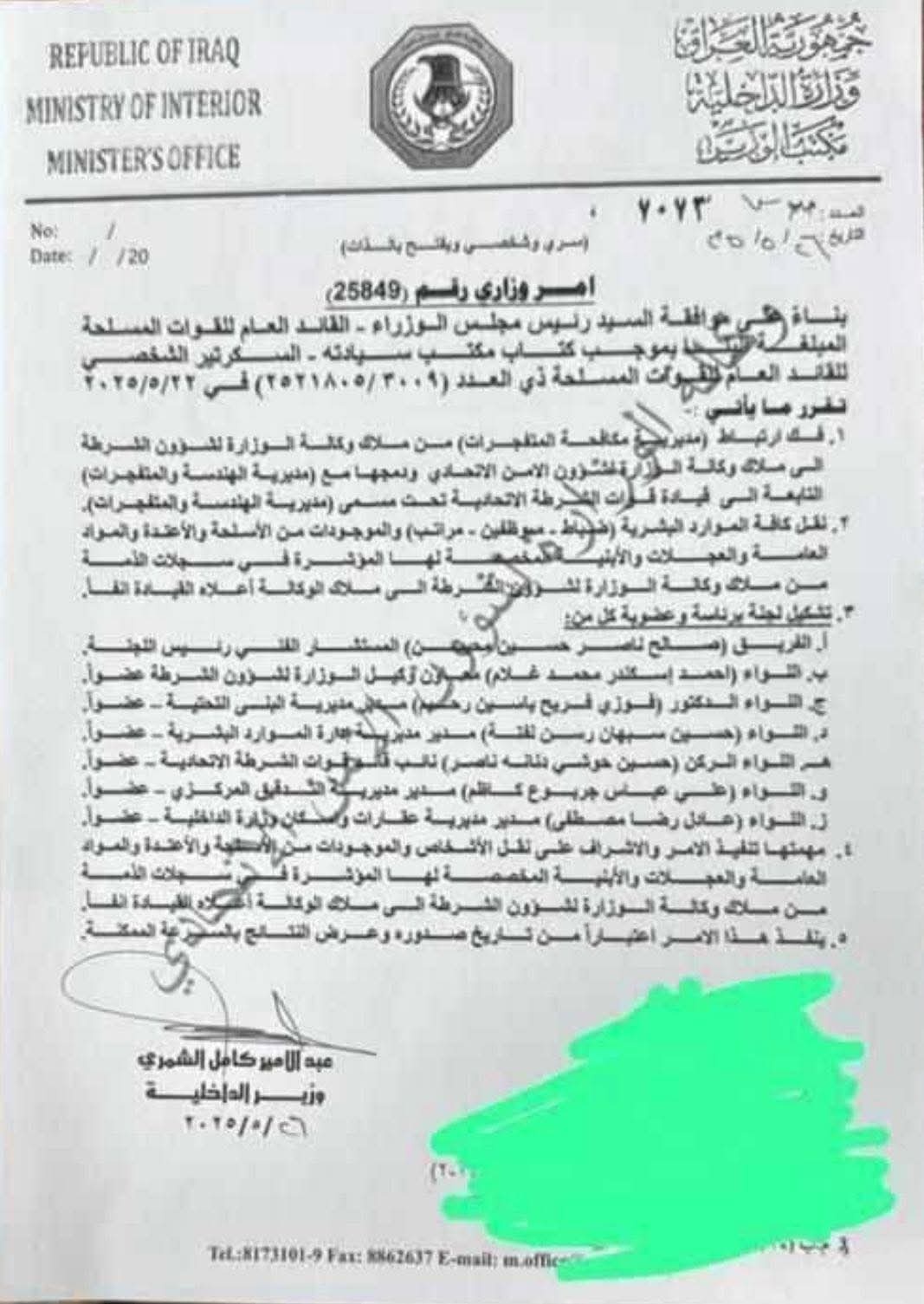 وجاء ذلك في وثيقة رسمية صادرة عن الوزارة، "، تُفيد بأنه "بناءً على موافقة رئيس مجلس الوزراء، القائد العام للقوات المسلحة، تقرر فك ارتباط مديرية مكافحة المتفجرات من ملاك وكالة الوزارة لشؤون الشرطة إلى ملاك وكالة الوزارة لشؤون الأمن الاتحادي، ونقل كل ما يتعلق بها، ودمجها مع مديرية الهندسة والمتفجرات".