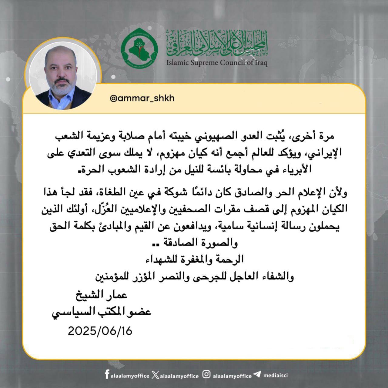*عضو المكتب السياسي للمجلس الاعلى عمار الشيخ: قصف الإعلام الإيراني يكشف عجز الكيان الصهيوني أمام إرادة الشعوب الحرة*
