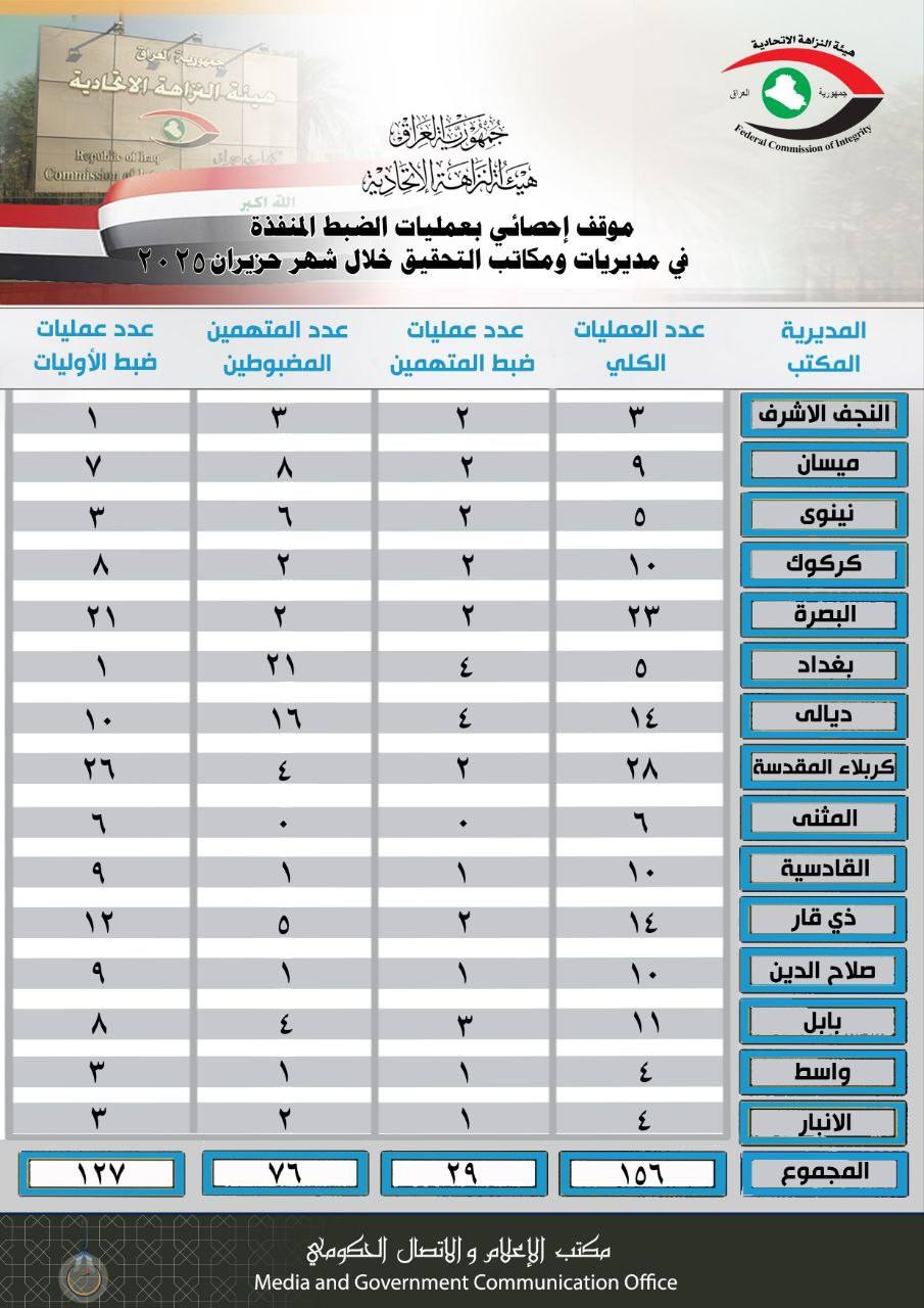 أعلنت هيئة النزاهة، اليوم الأربعاء، (2 تموز 2025)، عن موقف إحصائي بعمليات الضبط المنفذة من قبل مديريات ومكاتب تحقيق الهيئة خلال شهر حزيران لعام 2025.