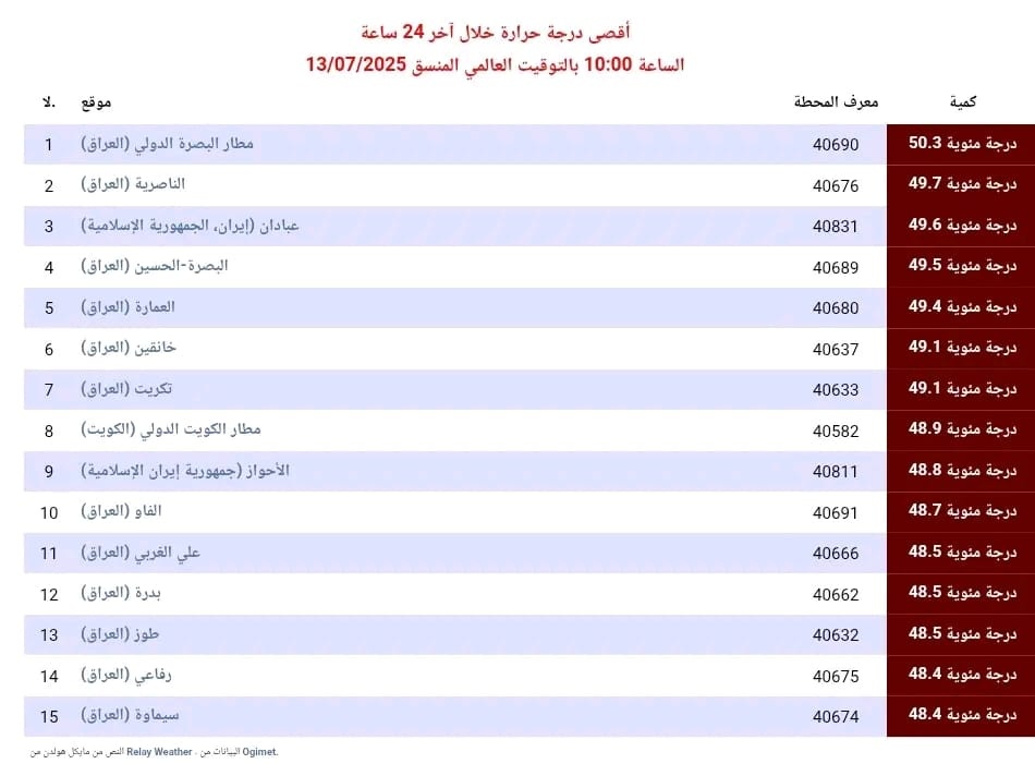 تصدرت، اليوم الاحد (13 تموز 2025)، 12 مدينة عراقية أعلى قائمة درجة حرارة على كوكب الأرض خلال 24 ساعة الماضية.