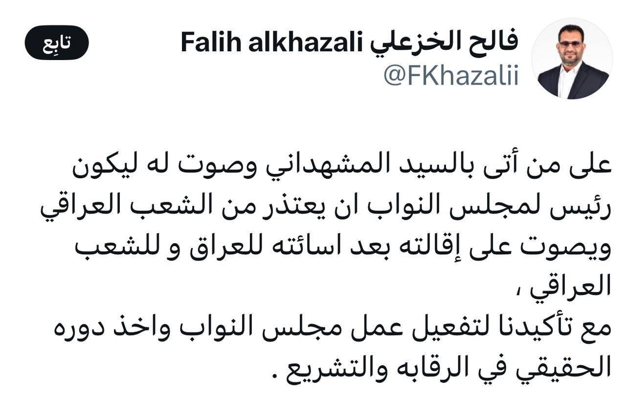 النائب فالح الخزعلي مغردًا : على من أتى بالسيد المشهداني وصوت له ليكون رئيس لمجلس النواب ان يعتذر من الشعب العراقي