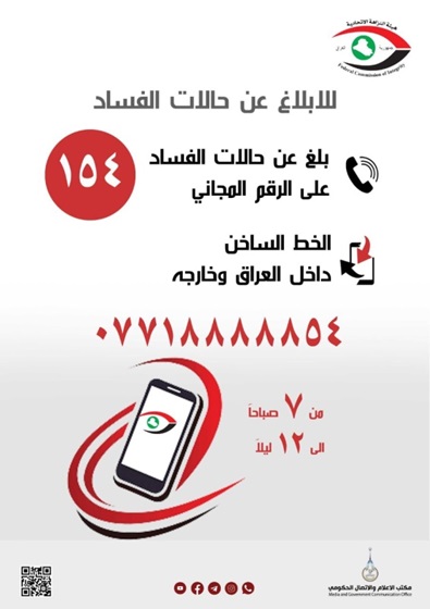 الهيئة وفي بيان أشارت إلى أنَّه في إطار مواكبة تطوير آليات العمل في مجال تلقّي معلومات الإبلاغ عن شبهات الفساد، فإنَّ تلقّي الاتصالات الهاتفيَّة الخاصَّة بالشكاوى والبلاغات عن قضايا الفساد الإداريّ والماليّ سيكون من الساعة (السابعة صباحاً لغاية الساعة الثانية عشرة من منتصف الليل)،على الرقم المجاني (154) ضمن نطاق كلّ محافظةٍ، والخط الساخن (07718888854) المُخصّص لتلقّي الاتصالات من داخل العراق وخارجه، وفقاً لخاصيَّة الدفع المسبق".
