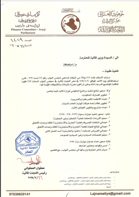 ونشر العطواني، محاور الاجتماع المقرر مع وزيرة المالية وكما موضح أدناه: