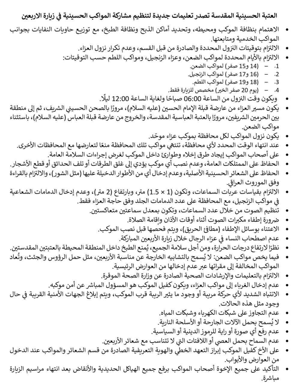 العتبة الحسينية المقدسة تعليمات جديدة لتنظيم مشاركة المواكب الحسينية في زيارة الاربعين.