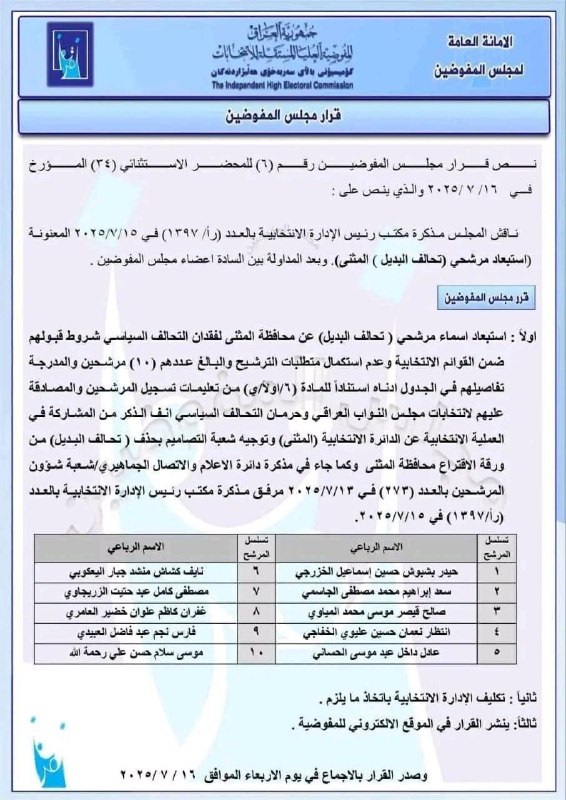 المفوضية العليا للانتخابات تستبعد مرشحي "تحالف البديل" في المثنى لعدم استيفاء الشروط