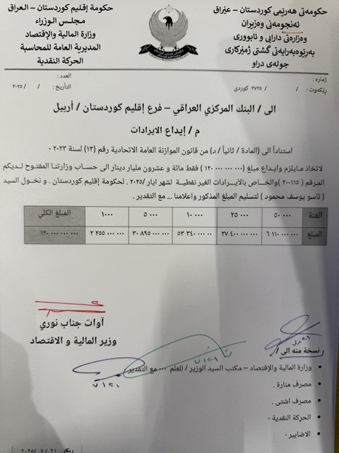 أعلنت وزارة المالية والاقتصاد في حكومة إقليم كردستان، اليوم الثلاثاء، تحويل 120 مليار دينار من حصة الخزينة الاتحادية من الإيرادات غير النفطية لشهر أيار الماضي إلى حساب وزارة المالية في بغداد.