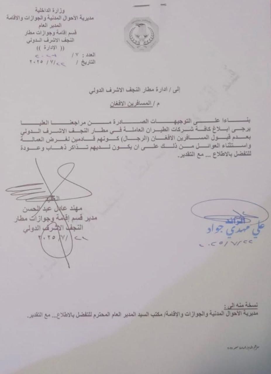 اصدرت وزارة الداخلية قرارا بمنع دخول الرجال الافغان الى العراق ، عبر مطار النجف ، بعد ورورد معلومات عن قدومهم لغرض العمالة .
