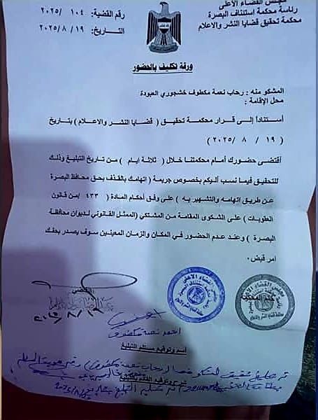 كشف مصدر مطلع، عن صدور دعوة جديدة بحق النائبة السابقة رحاب العبودة، بناءً على دعوى مقدمة من محافظ البصرة، مشيرا إلى وجود أمر قضائي باستقدامها إلى محكمة النشر.