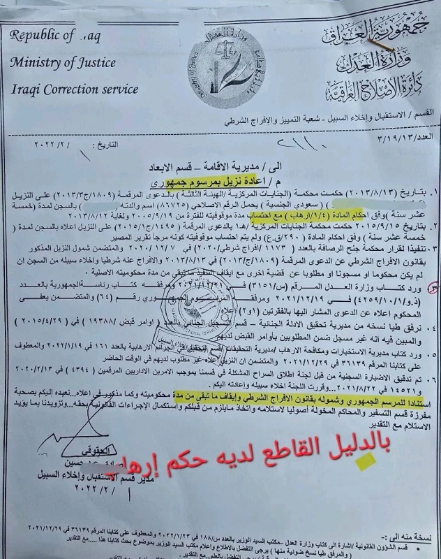 في المقابل، ردّ النائب أمير المعموري بتغريدة وأسندها بوثيقة، قال فيها: "رداً على بيان رئيس الجمهورية، لكم الدليل أن العفو الخاص تم ممن كان لديه (4 إرهاب)، وهذا الموضوع استشهدنا به داخل جلسة مجلس النواب لغرض إطلاق سراح الشباب المعتمرين المحتجزين في المملكة العربية السعودية، ونعمل بالدليل وفق دورنا الرقابي".