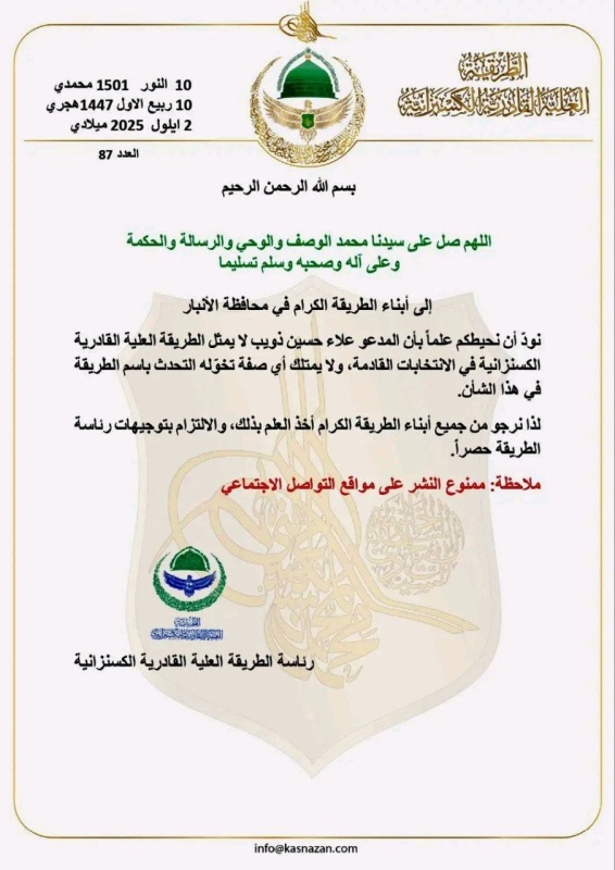 أعلنت رئاسة الطريقة العلية القادرية الكسنزانية، اليوم الثلاثاء (2 أيلول 2025)، أن المدعو علاء حسين ذويب لا يمثل الطريقة في الانتخابات المقبلة، ولا يملك أي صفة رسمية تخوله الحديث باسمها في هذا الشأن.