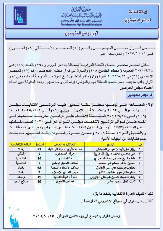 أقر مجلس المفوضين في المفوضية العليا المستقلة للانتخابات بحسب وثيقة، مؤرخة الاثنين (15 أيلول 2025)، توصية اللجنة المركزية المشكلة بالأمر الوزاري، بشأن المصادقة على أهلية ثمانية مرشحين لانتخابات مجلس النواب المقبلة، بعد استكمال التدقيق الأمني والإداري الخاص بسيرهم وملفاتهم.