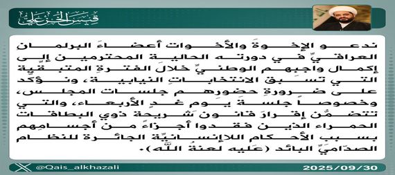 دعا امين عام عصائب اهل الحق الشيخ قيس الخزعلي اعضاء مجلس النواب لحضور جلسة غد الاربعاء.