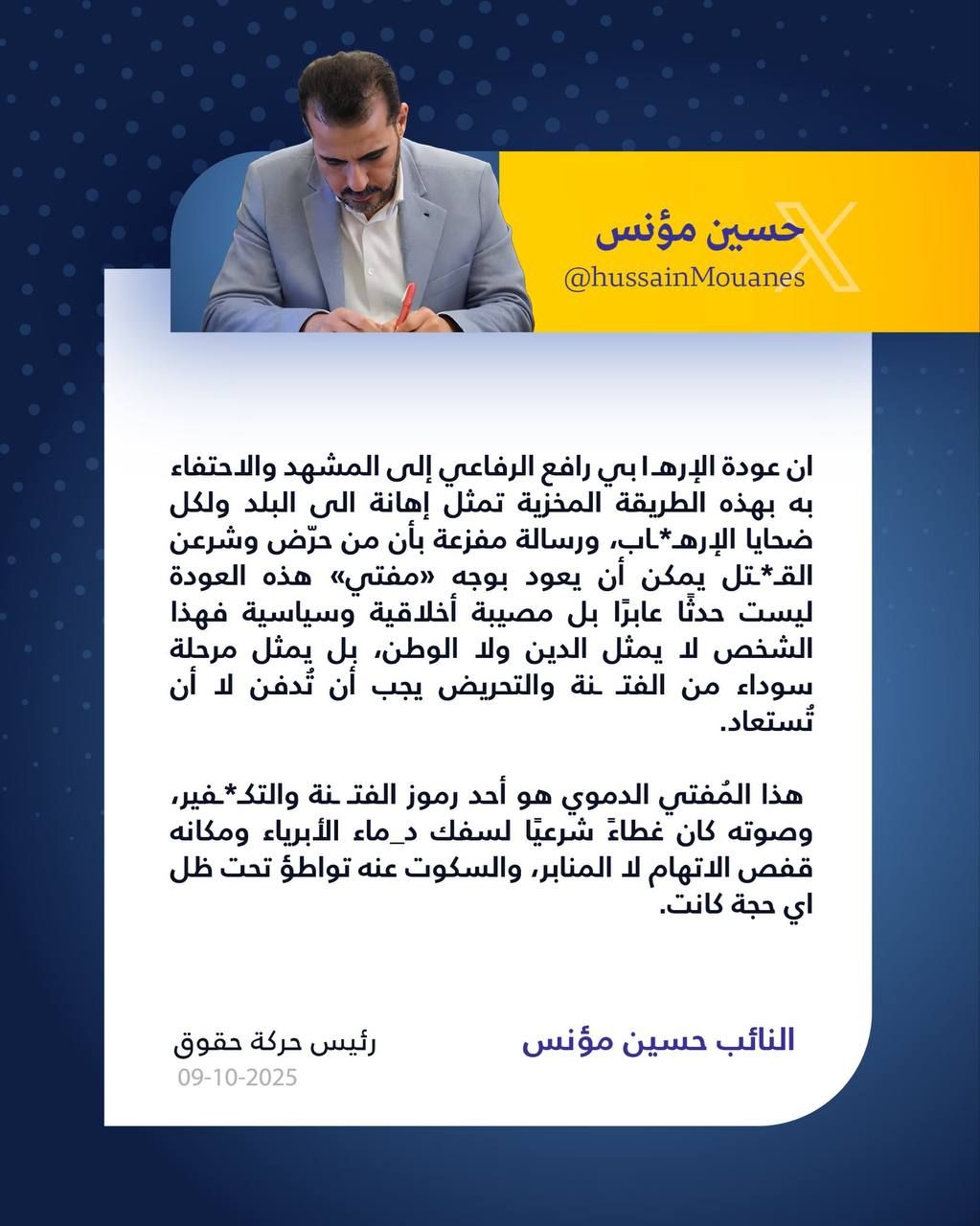 رئيس حركة حقوق النائب حسين مؤنس: عودة الارهابي رافع الرفاعي تمثل اهانة للبلد ولكل ضحايا الارهاب