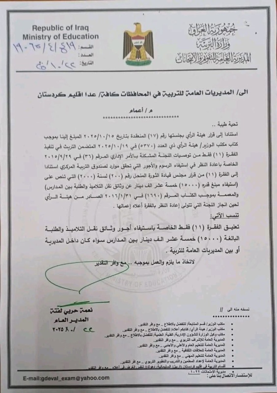 وذكرت الوزارة بحسب وثيقة اليوم الخميس (23 تشرين الأول 2025)، أن "المديرية العامة للتقويم والامتحانات أصدرت تعميماً إلى المديريات العامة للتربية في المحافظات كافة (عدا إقليم كردستان)، استناداً إلى قرار هيئة الرأي في جلستها رقم (17) المنعقدة بتاريخ 15 تشرين الأول 2025، القاضي بالتريث في تنفيذ الفقرة (11) من توصيات اللجنة المشكلة بالأمر الإداري رقم (36) لسنة 2015، الخاصة باستيفاء الرسوم والأجور التي تحقق موارد الصندوق المركزي للتربية".
