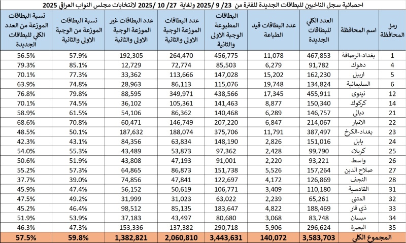 وبحسب وثيقة اليوم الاثنين (27 تشرين الأول 2025)، فإن "أكثر من 1.4 مليون بطاقة ما زالت غير موزعة وغير مطبوعة، وهو ما يعكس حجم التحديات اللوجستية التي تواجه عملية توزيع البطاقات الانتخابية".