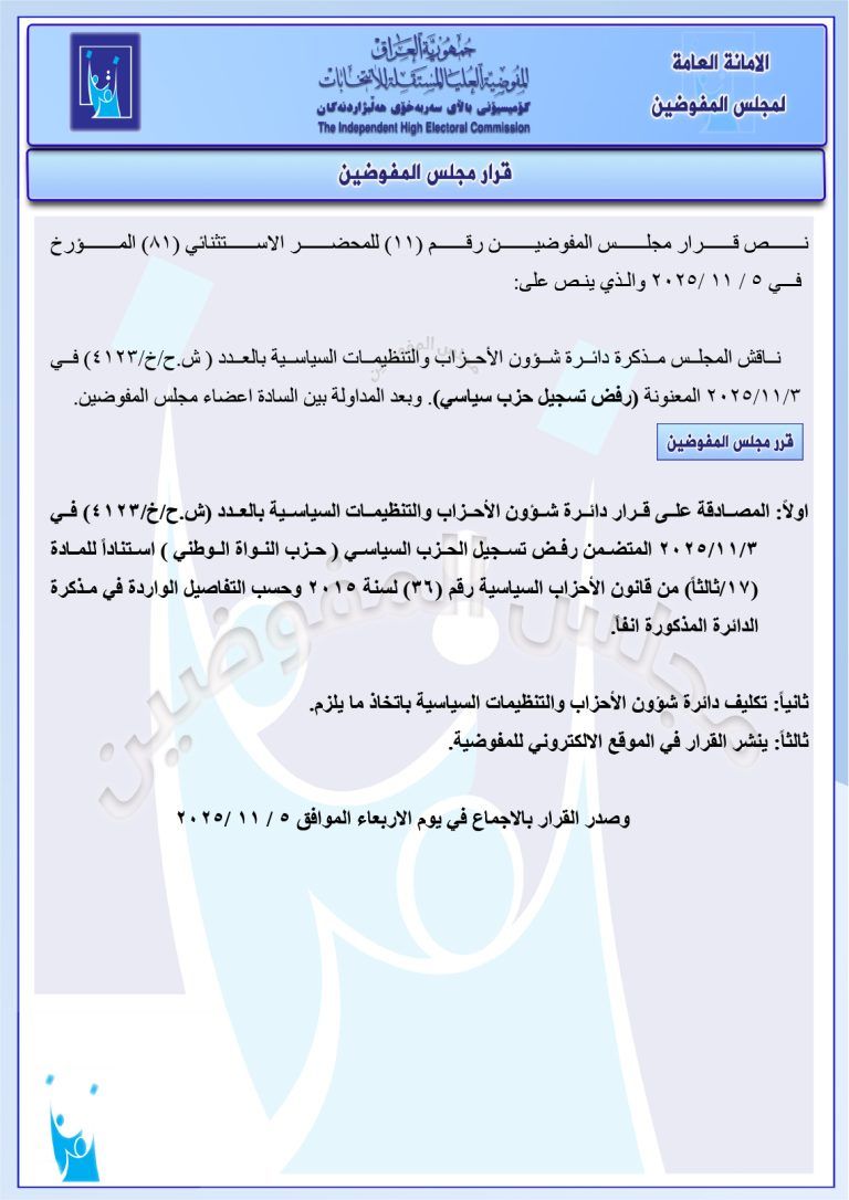 رفض مجلس المفوضين في المفوضية العليا المستقلة للانتخابات ، تسجيل حزب سياسي، كما فرض غرامة على مرشح في السليمانية بقيمة 5 ملايين دينار لمخالفته نظام الحملات الانتخابية.