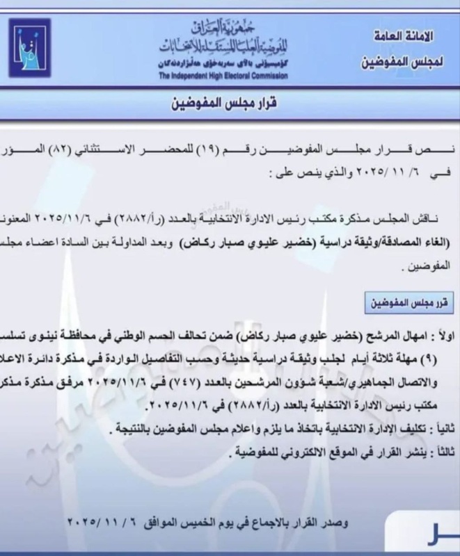 أصدر مجلس المفوضين في المفوضية العليا المستقلة للانتخابات ، اليوم الجمعة (7 تشرين الثاني 2025)، قراراً بمنح المرشح خضير عليوي صبار ركاض عن تحالف الحسم الوطني في محافظة نينوى، مهلة ثلاثة أيام لتقديم وثيقة دراسية حديثة.