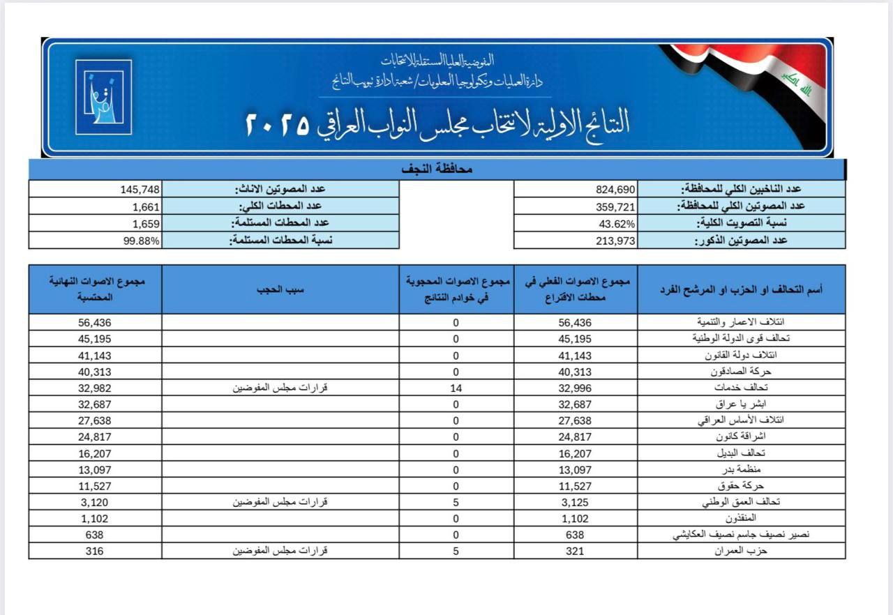 النتائج الأولية للانتخابات النيابية في النجف الاشرف