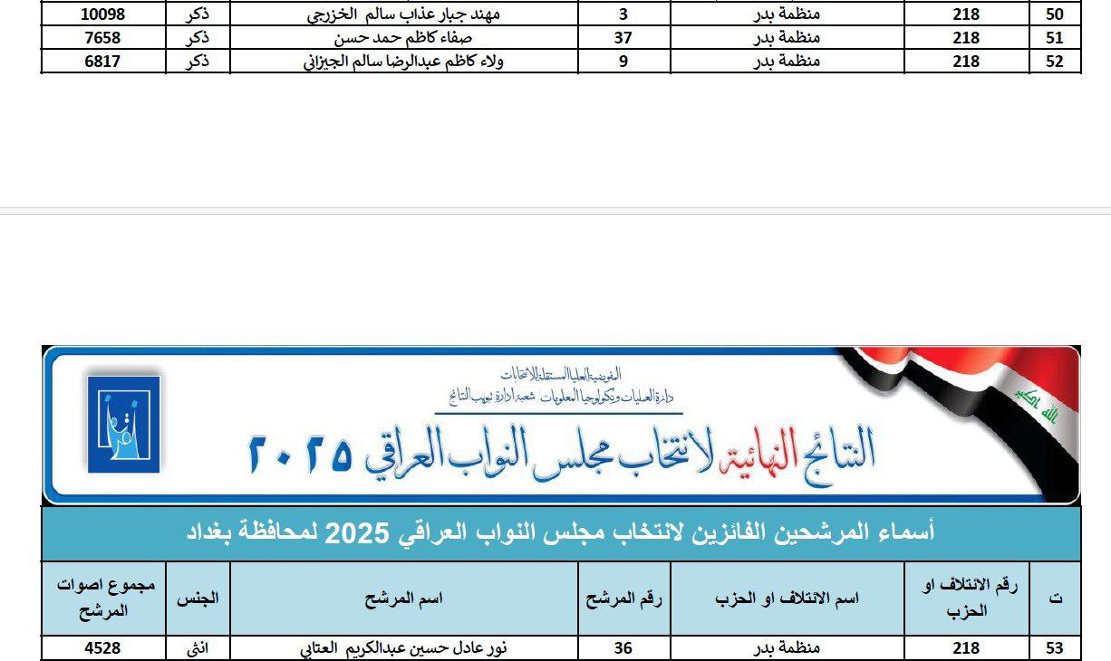 اسماء النواب الفائزين من منظمة بدر عن محافظة بغداد