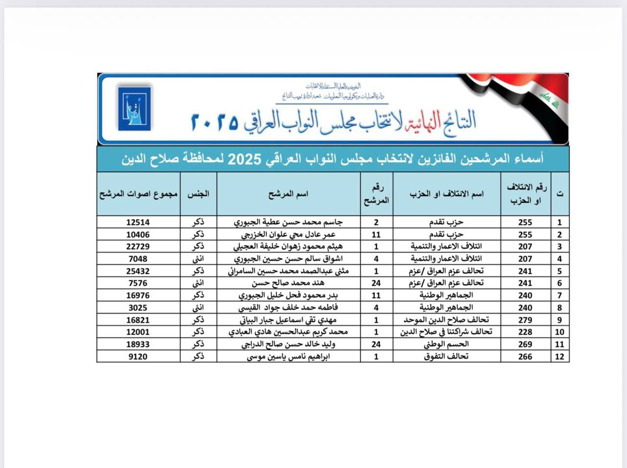 اسماء الفائزين في الانتخابات البرلمانية يمحافظة صلاح الدين