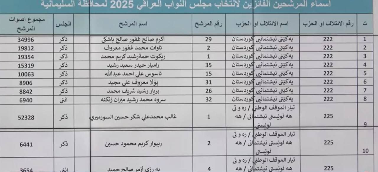اسماء الفائزين في الانتخابات البرلمانية بمحافظة السليمانية