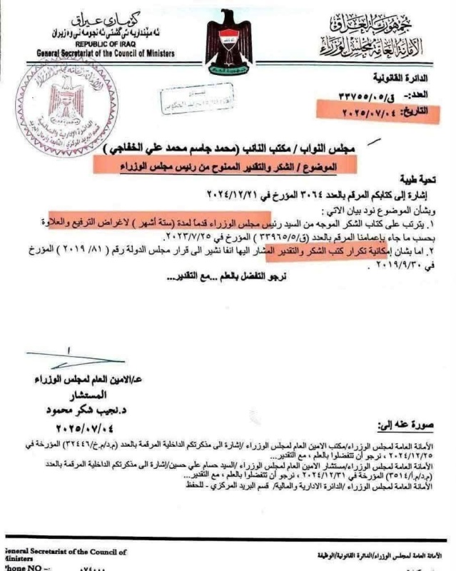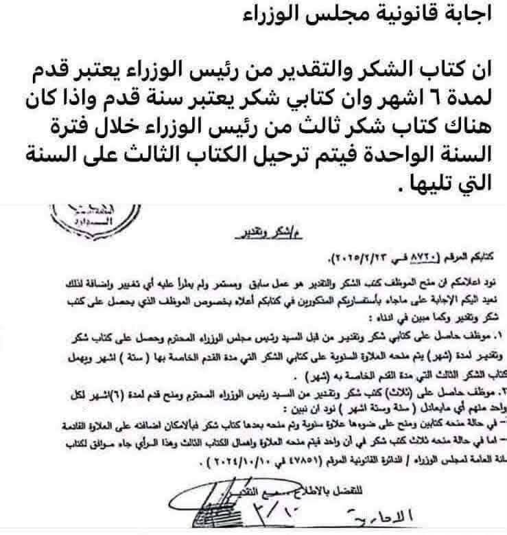 أظهرت وثيقة صادرة عن وزارة الماليّة رداً على كتاب الأمانة العامة لمجلس الوزراء بشأن آليّة احتساب كتب الشكر والتقدير الممنوحة من رئيس الوزراء للموظّفين، موضحةً أنّ كتاب الشكر الواحد يُعدّ خدمة لمدّة (6) أشهر، وأنّ كتابي شكر يُحتسبان خدمة سنة كاملة، على أن يُرحَّل أي كتاب شكر ثالث يصدر خلال السنة نفسها ليُحتسب على السنة التي تليها.