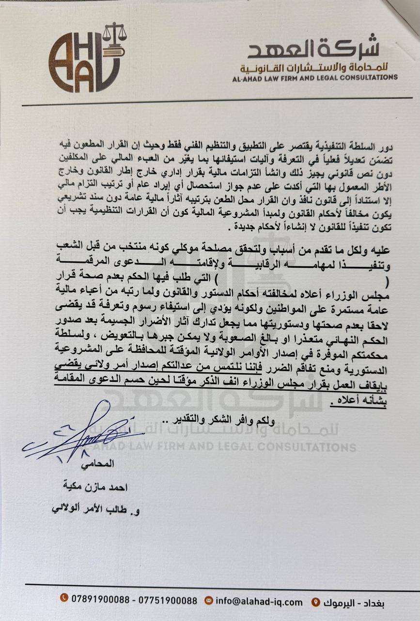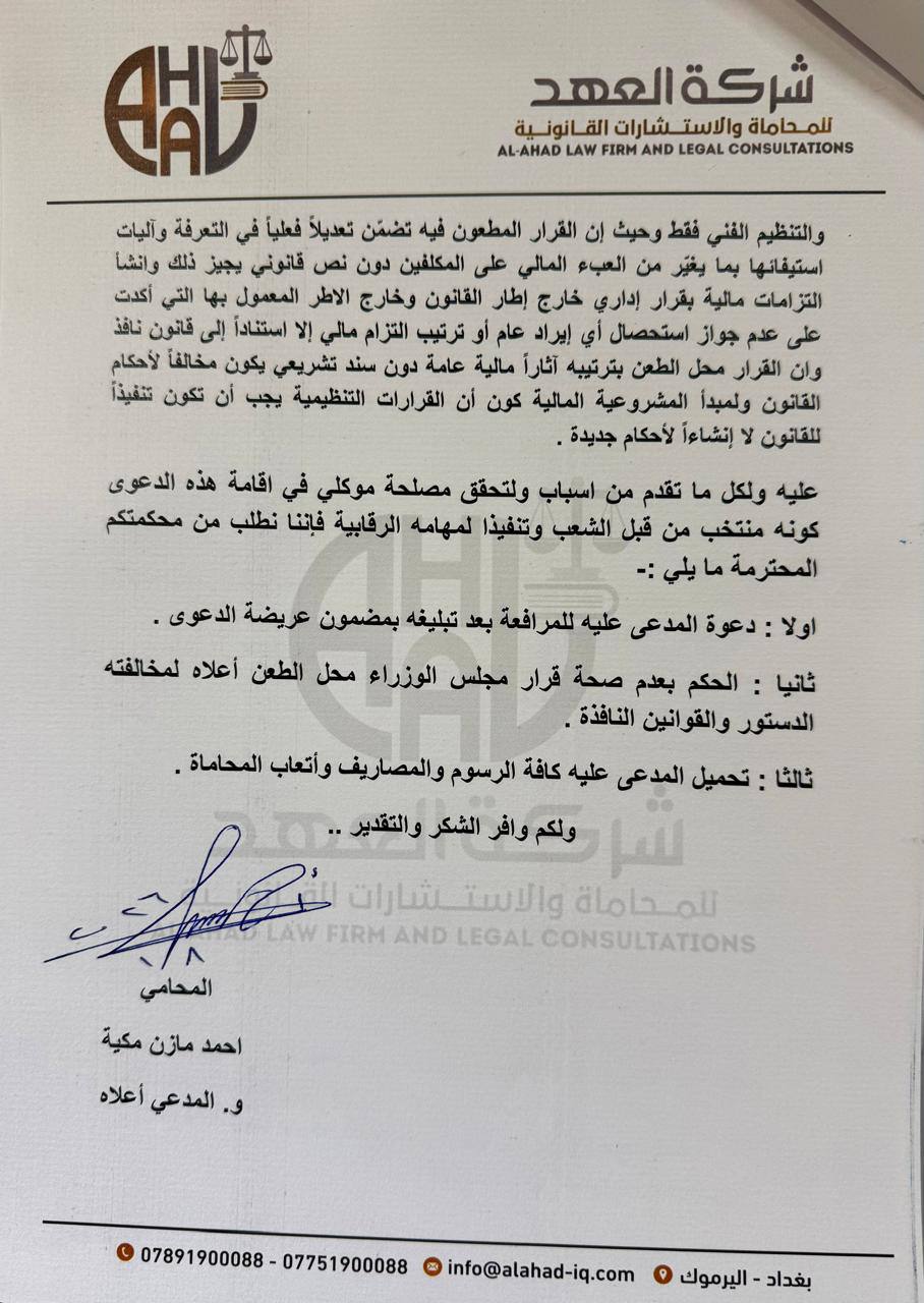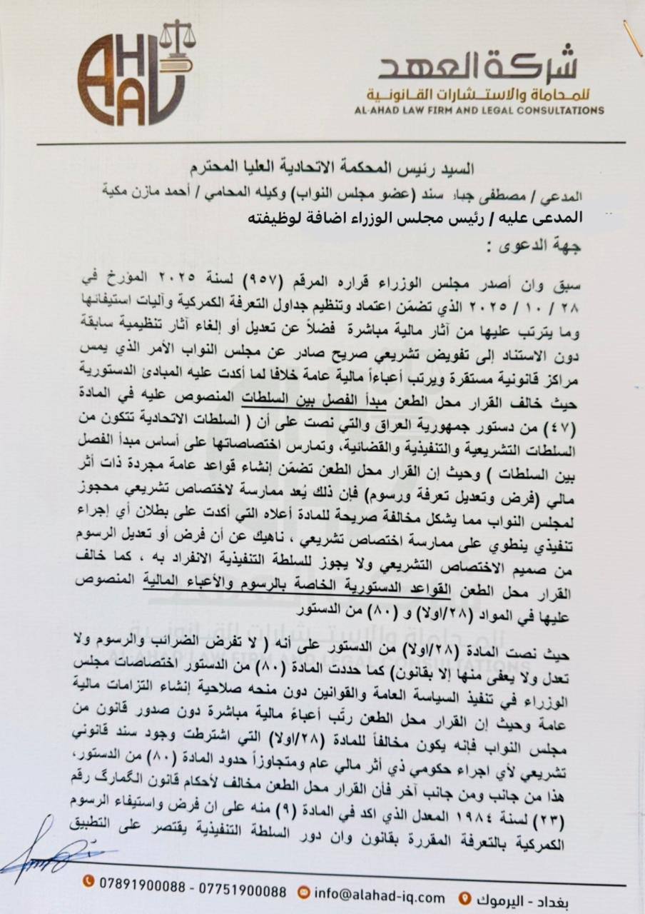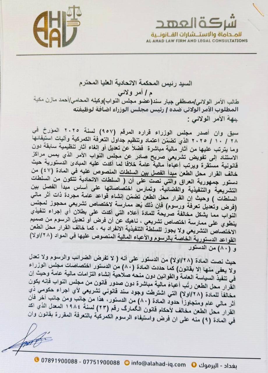 قدم النائب مصطفى سند شكوى لدى المحكمة الاتحادية لطلب امر ولائي و فتح دعوى ضد الحكومة حول الرسوم الگمرگية الجديدة
