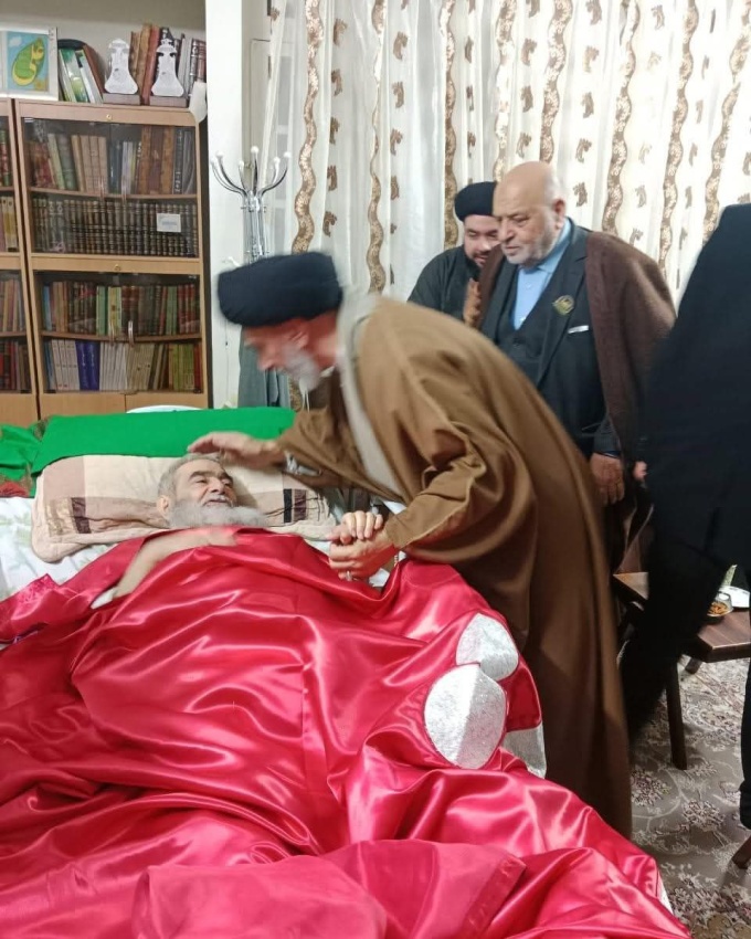 وفد العتبة الحسينية يزور شقيق المرجع الاعلى السيد السيستاني ويهديه راية قبة الإمام الحسين