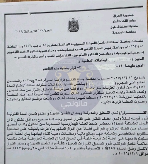 أقرت محكمة استئناف بابل الاتحادية، اليوم الثلاثاء ( 20 كانون الثاني 2026 )، بصفتها التمييزية، قرار إدانة متهم قام بالاستيلاء على أموال ومصوغات ذهبية تعود لإحدى المواطنات، مستخدماً أسلوب "التنويم المغناطيسي" كوسيلة للاحتيال.