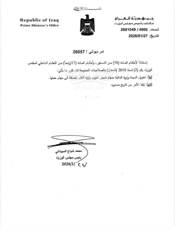 أصدر رئيس مجلس الوزراء محمد شياع السوداني، اليوم الثلاثاء ( 27 كانون الثاني 2026 )،أمراً ديوانياً يقضي بتخويل وزيرة المالية طيف سامي بمهام تسيير شؤون وزارة النقل، إضافةً إلى مهامها الحالية.