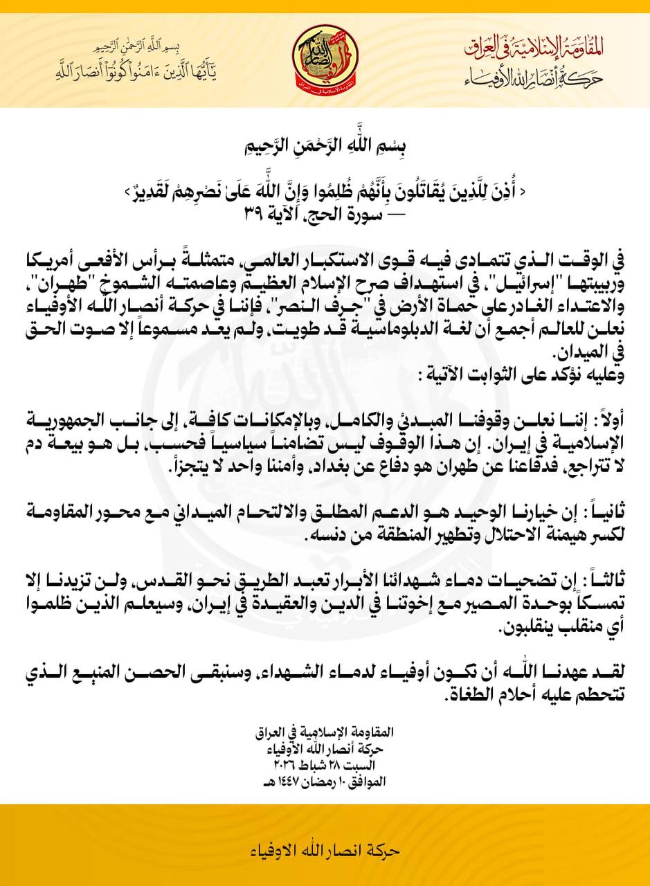 أنصار الله الأوفياء: نعلن وقوفنا المبدئي والكامل، وبالإمكانات كافة، إلى جانب الجمهورية الإسلامية في إيران .
