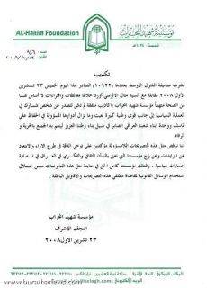 مؤسسة شهيد المحراب تصدر بيانا حول الاكاذيب التي نقلتها جريدة الشرق الأوسط عن لسان المدعو مثال الآلوسي