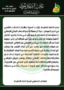 سرايا أنصار العقيدة تؤكد أهمية مشاركة الحشد الشعبي في تحرير الموصل ،