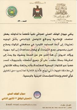 الوقف السني ينفي تحذير أئمة في كركوك وصلاح الدين من جمع تبرعات لكرد سوريا