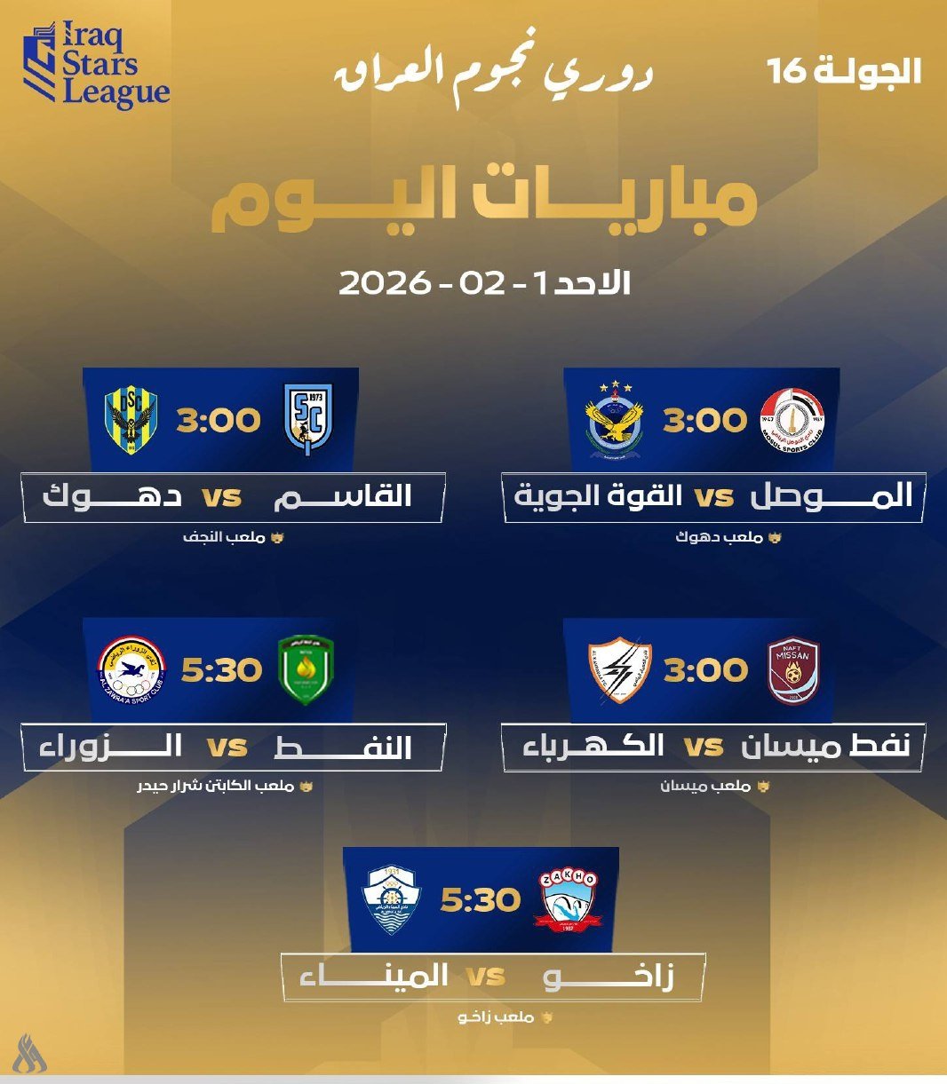 تختتم، اليوم الأحد، منافسات الجولة السادسة عشرة من دوري نجوم العراق لكرة القدم، بإقامة خمس مباريات مهمة على ملاعب مختلفة، حيث يحتضن ملعب دهوك مواجهة مرتقبة تجمع فريقي الموصل والقوة الجوية عند الساعة الثالثة عصراً، وفي التوقيت ذاته يلتقي فريق القاسم ضيفه دهوك على ملعب النجف، فيما يستضيف ملعب ميسان الأولمبي مباراة نفط ميسان والكهرباء عند الساعة الثالثة عصراً أيضاً، فيما تتجه الأنظار في الساعة الخامسة والنصف مساءً إلى ملعب الكابتن شرار حيدر، حيث يواجه فريق النفط ضيفه الزوراء، بينما يشهد ملعب الأول في التوقيت نفسه مباراة تجمع زاخو والميناء، في ختام مباريات الجولة.