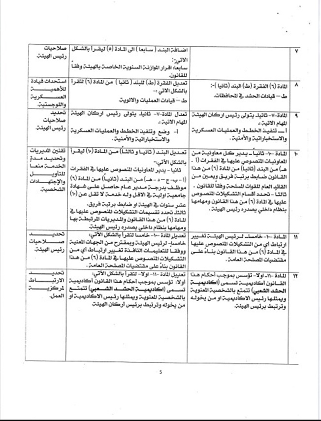 ومن أبرز فقرات مشروع القانون، تأسيس (هيئة الحشد الشعبي) وترتبط بالقائد العام للقوات المسلحة، وتأسيس (اكاديمية الحشد الشعبي)، ويكون رئيس هيئة الحشد بدرجة وزير شريطة حصوله على شهادة جامعية أولية في الأقل وله خدمة لا تقل عن 10 سنوات في المجال العسكري أو الأمني.