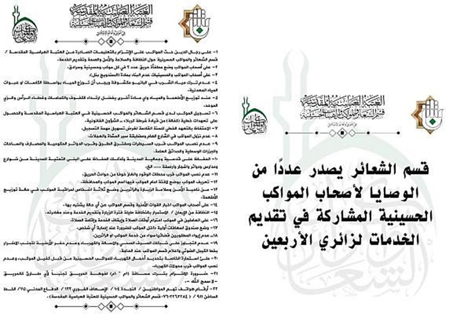 وتضمنت التوجيهات حثّ المواكب على الالتزام بالتعليمات الصادرة من العتبة العباسية المقدسة بشأن النظافة والسلامة والأمن والصحة وتقديم الخدمة، ووضع مطفآت حريق ، وعدم البناء بمادة (السندويج بنل)، و عدم ترك مياه الشرب مكشوفة ، وتسجيل الموكب لدى قسم الشعائر والمواكب والهيآت الحسينية في العتبة العباسية المقدسة، والحصول على تعهدات خطية (كفالة) من قيادة شرطة كربلاء .