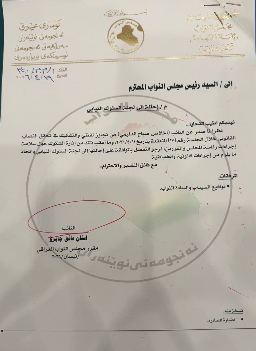 وجاء في طلب جابرو، انه "نظرا لما صدر عن النائب إخلاص صباح الدليمي من تجاوز لفظي والتشكيك في تحقق النصاب القانوني خلال الجلسة رقم (17) المنعقدة بتاريخ 11 نيسان الحالي، وما أعقب ذلك من إثارة الشكوك حول سلامة إجراءات رئاسة المجلس والمقررين، نرجو التفضل بالموافقة على إحالتها إلى لجنة السلوك النيابي واتخاذ ما يلزم من إجراءات قانونية وانضباطية".